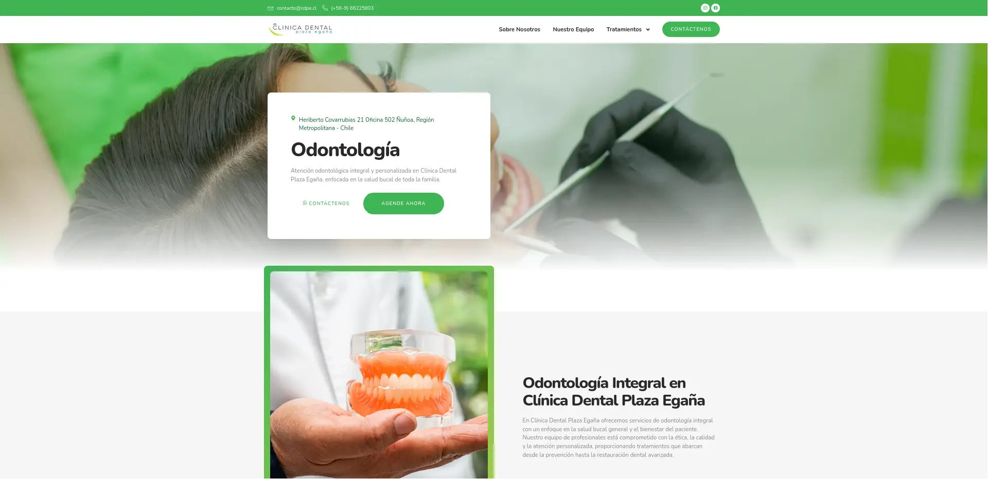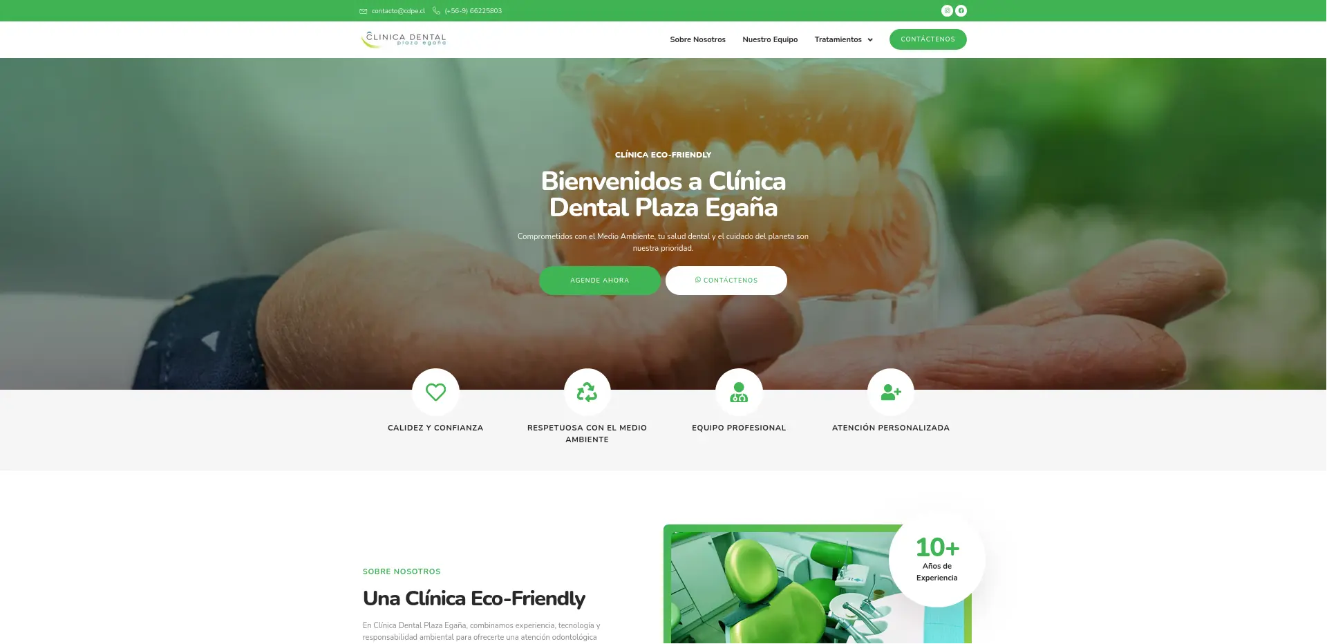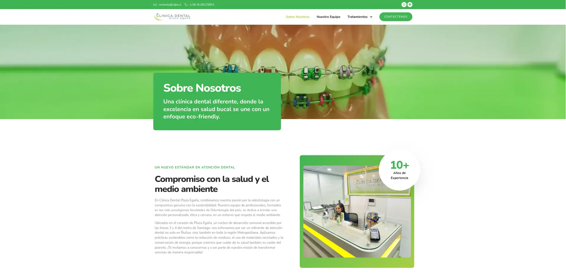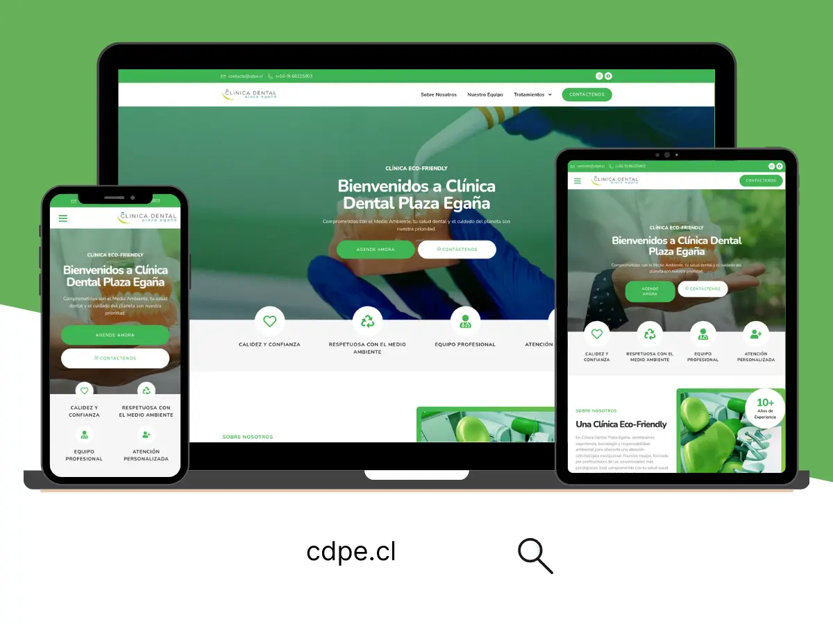 Clínica Dental Plaza Egaña es un centro odontológico con un enfoque eco-friendly, combinando salud bucal y compromiso con el medio ambiente. Su sitio web presenta un diseño fresco y limpio, con tonalidades verdes, navegación intuitiva e información clara sobre servicios y tratamientos, destacando la responsabilidad social y la atención personalizada.