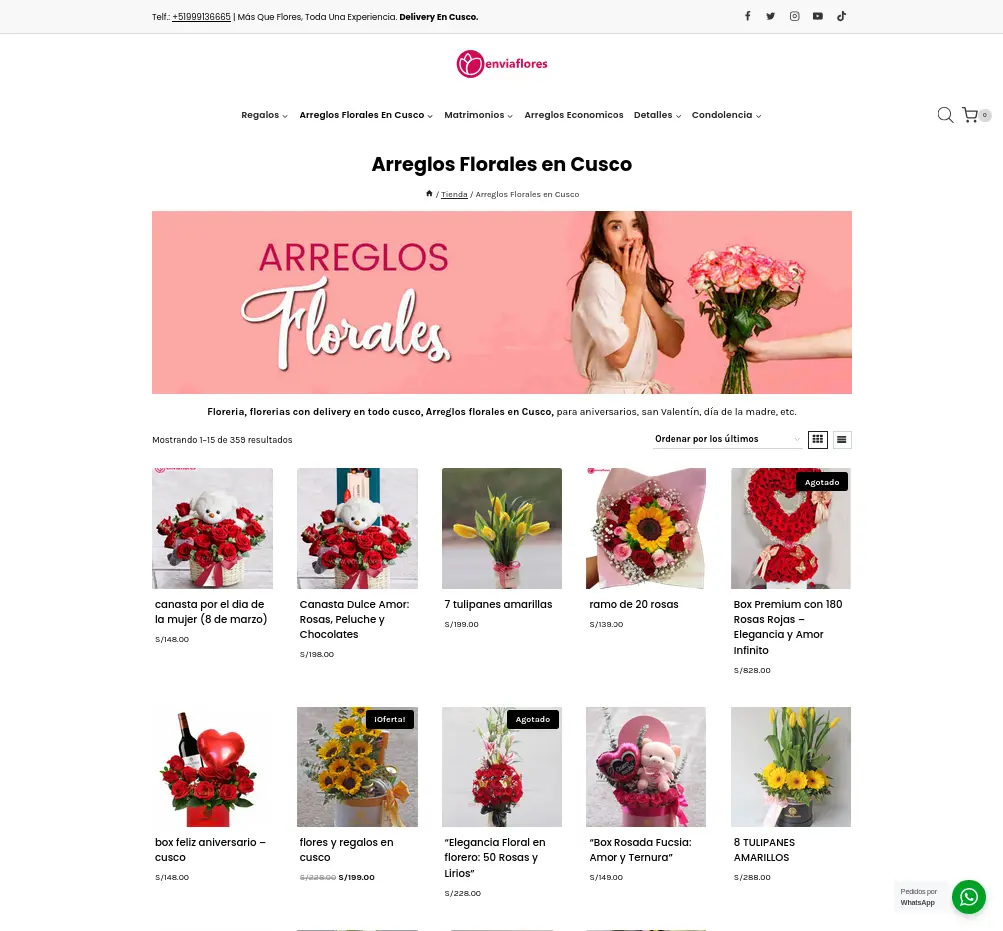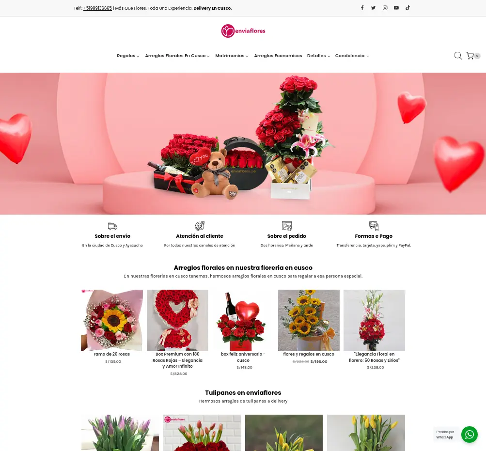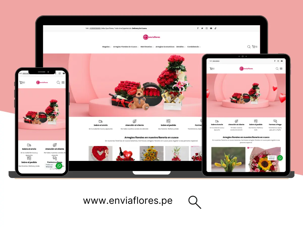 EnviaFlores.pe es una tienda en línea especializada en la venta y entrega de arreglos florales en Cusco. La web ofrece una experiencia atractiva y fácil de navegar, con una amplia variedad de opciones, desde arreglos románticos hasta flores para ocasiones especiales como matrimonios y condolencias. Además, proporciona información clara sobre envíos, atención al cliente y métodos de pago, asegurando un servicio eficiente y confiable.
